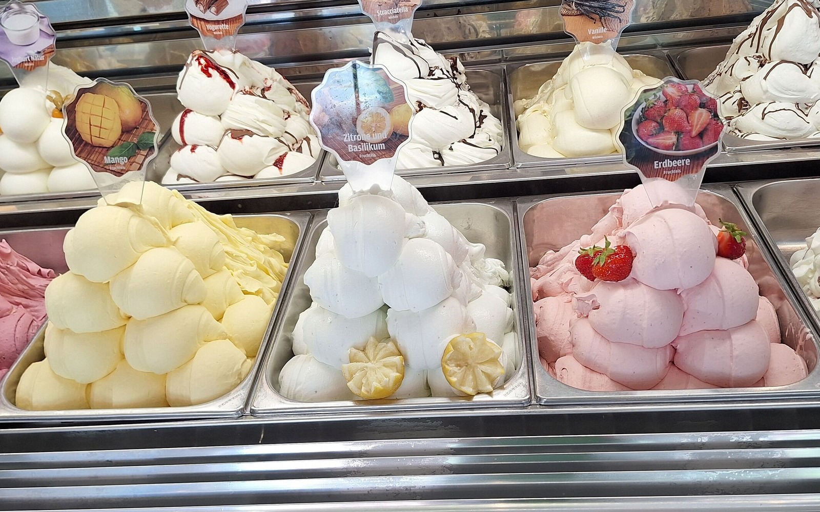 Neben dem klassischen Eis bietet das Café auch Eistorten an. Kunden können zwischen zwei Baiser-Schichten oder einem Schoko-Boden wählen und ihre Lieblingssorten, Früchte sowie Deko-Elemente wie Zuckerperlen, Schokosauce oder Smarties hinzufügen.
