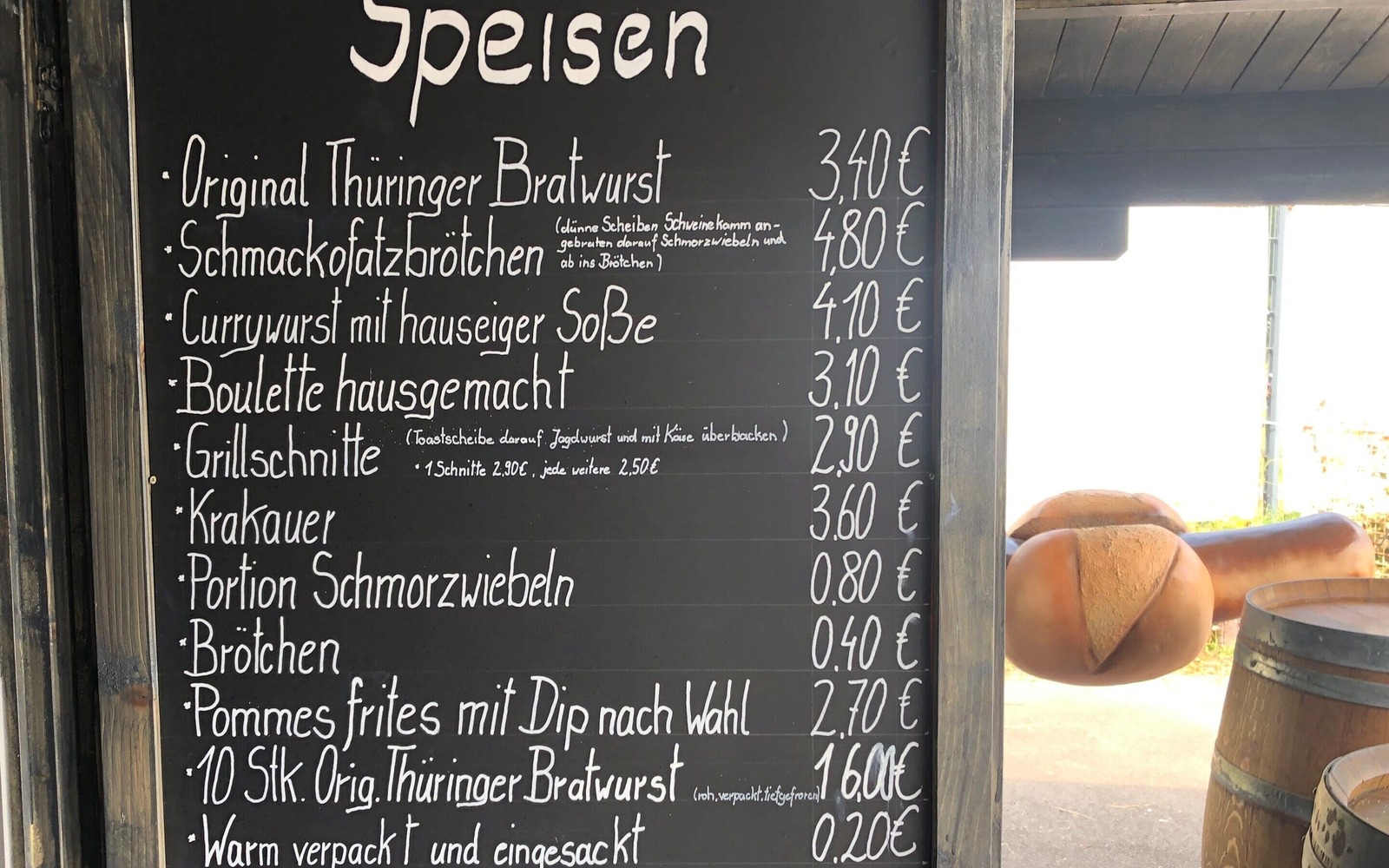 Kulinarisch bietet der Imbiss klassische, herzhaft gegrillte Spezialitäten. Besonders beliebt ist die original Thüringer Rostbratwurst, frisch vom Grill, die Currywurst mit Pommes sowie das kräftig belegte „Schmackofatz“-Brötchen.