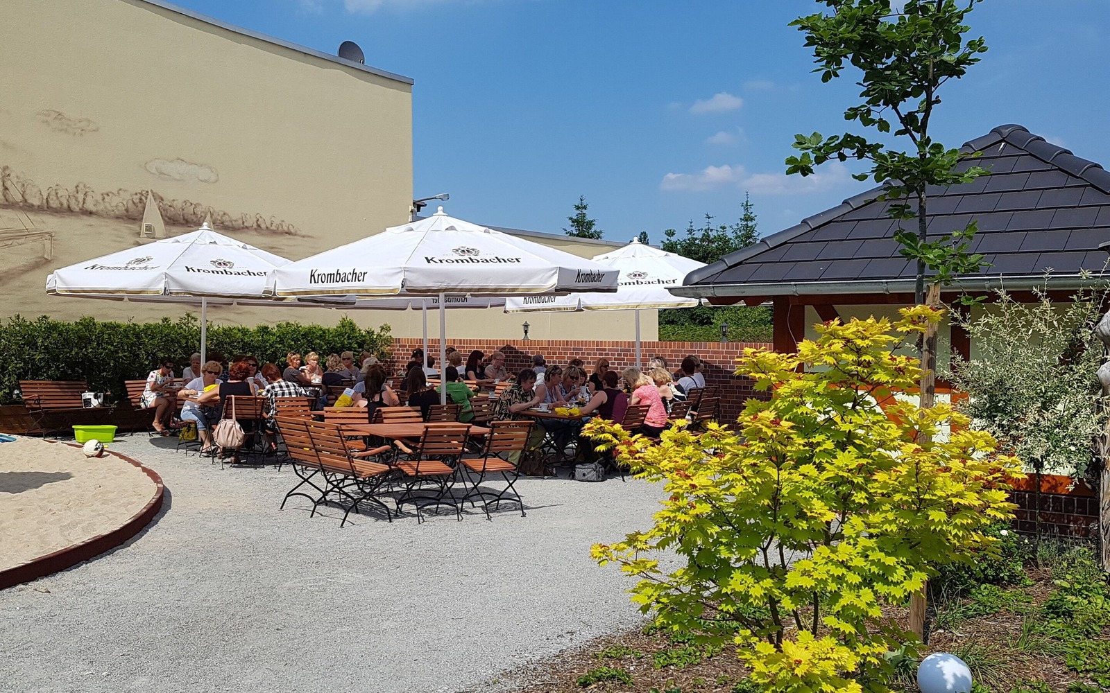 In den Sommermonaten ist der großzügige Biergarten geöffnet. Unter Sonnenschirmen lassen sich ein kühles Bier ebenso wie ein leckeres Gericht wie zum Beispiel ein liebevoll angerichteter Burger mit Pommes genießen. Der Biergarten ist umzäunt und auf dem Gelände ist ein Spielplatz mit Buddelzeug für die kleinen Gäste vorhanden, so dass sich auch die Eltern entspannt zurücklehnen können. Radurlauber finden ausreichend Fahrradständer vor.