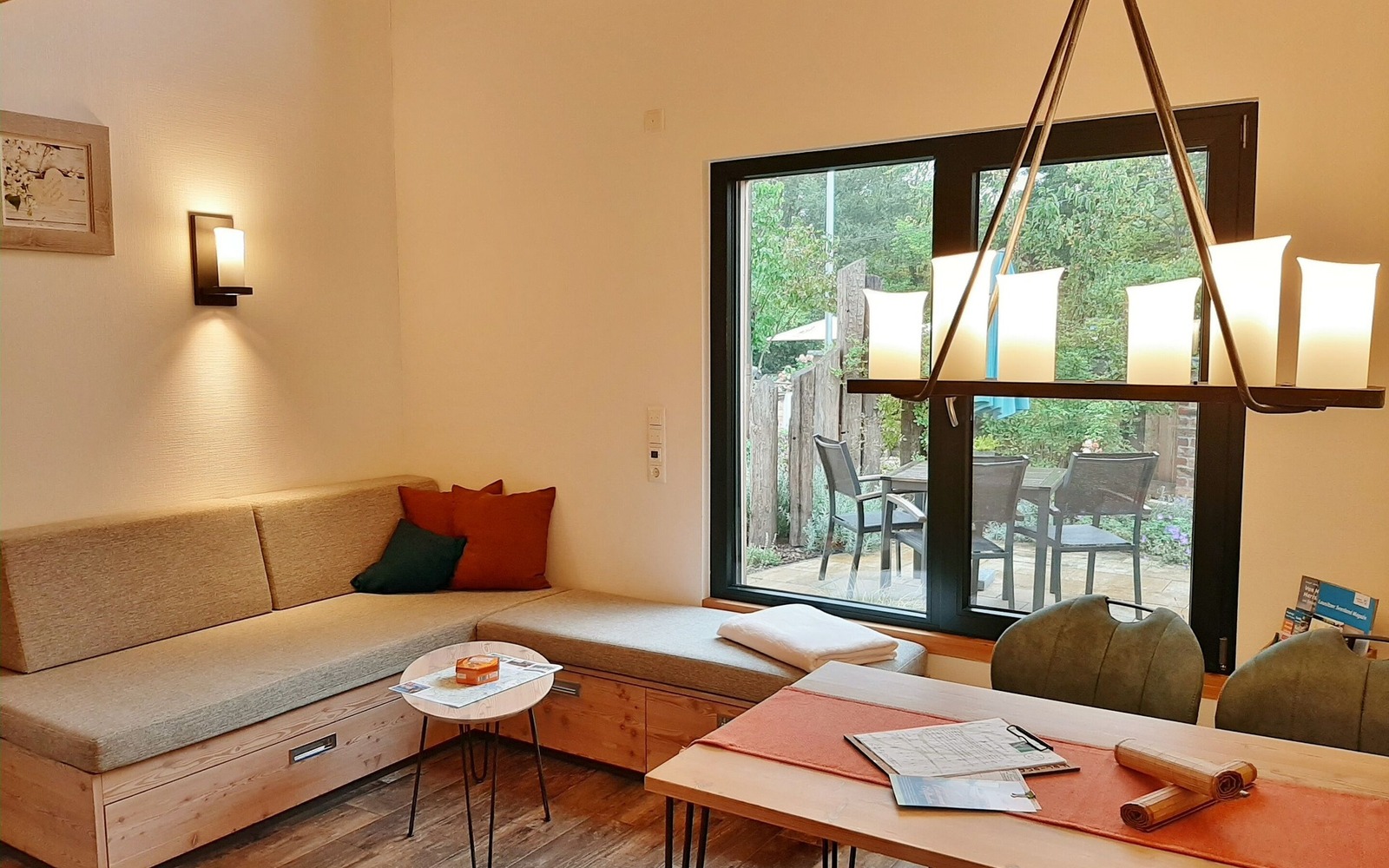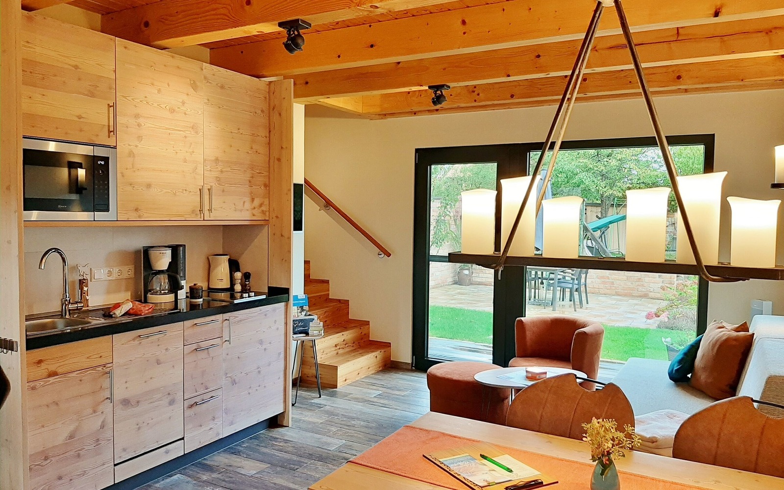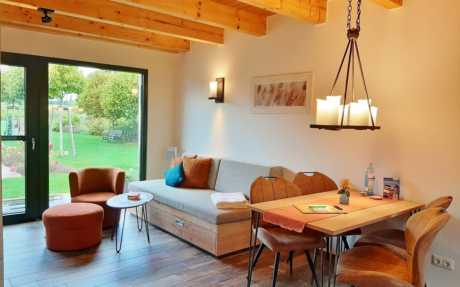 Im großen Ferienhaus (55 m²) finden bis zu 4 Personen Platz und ist im Erdgeschoss barrierefrei begehbar. Das Haus besitzt einen Wohnbereich mit integrierter Küchenzeile, einem großen modernen Badezimmer mit Dusche sowie 2 Schlafräumen im Obergeschoss. Jede Ferienwohnung verfügt über eine eigene Terrasse mit Sitzmöglichkeiten. Pkw- und Fahrradstellplätze sind für Gäste vorhanden.