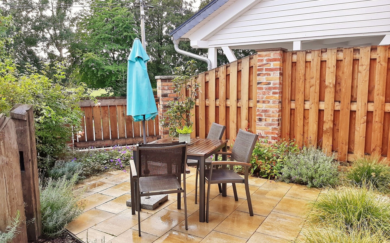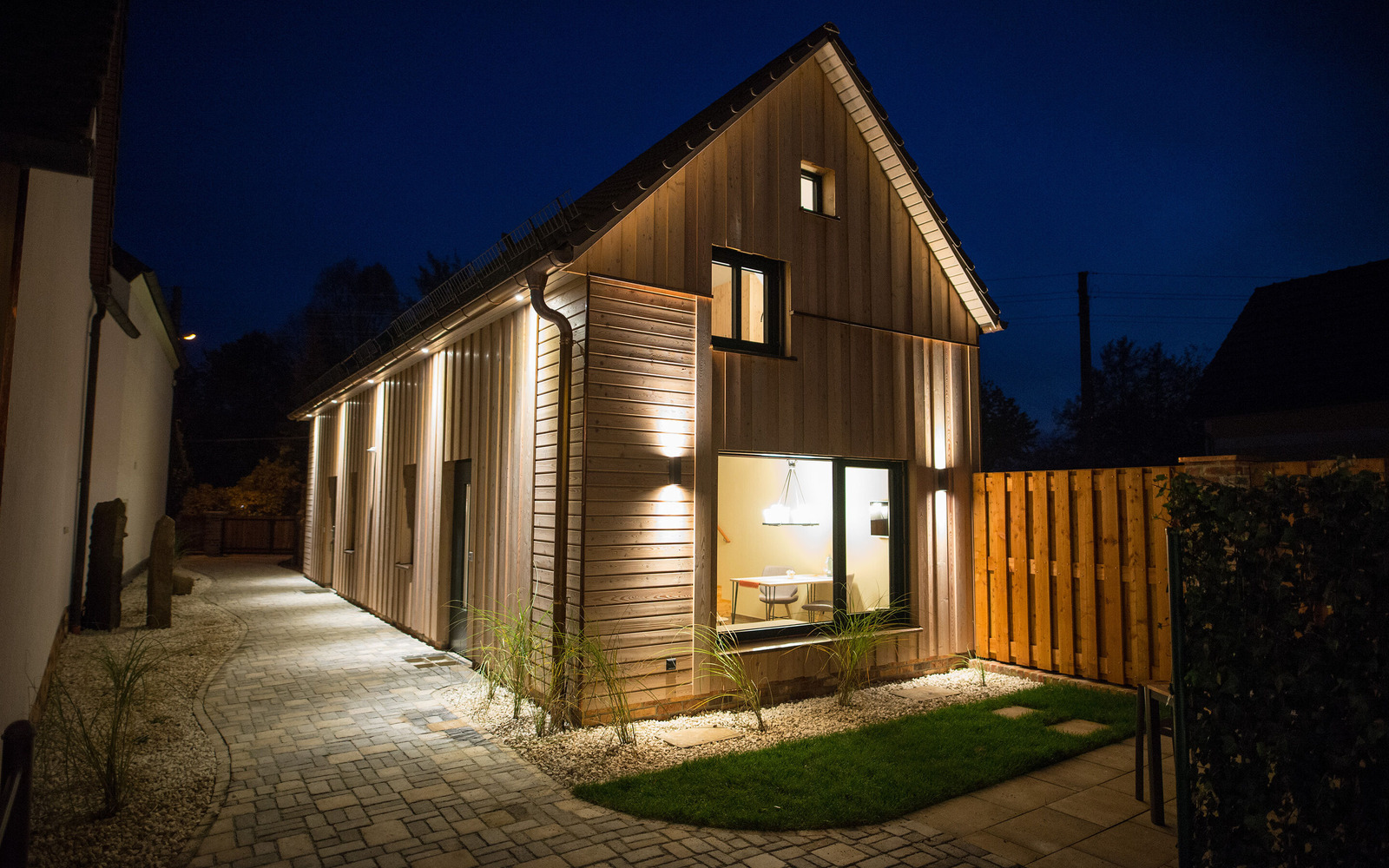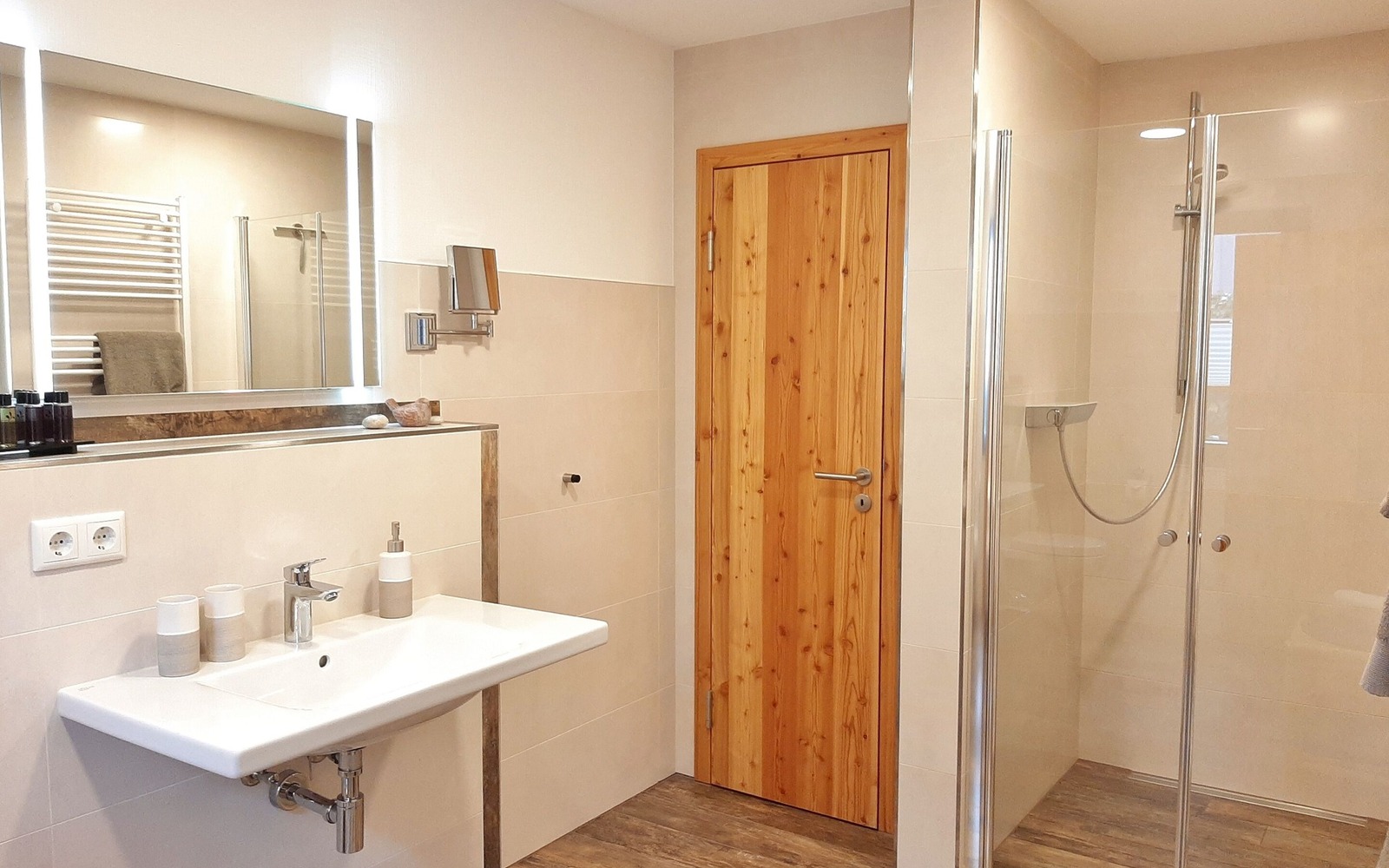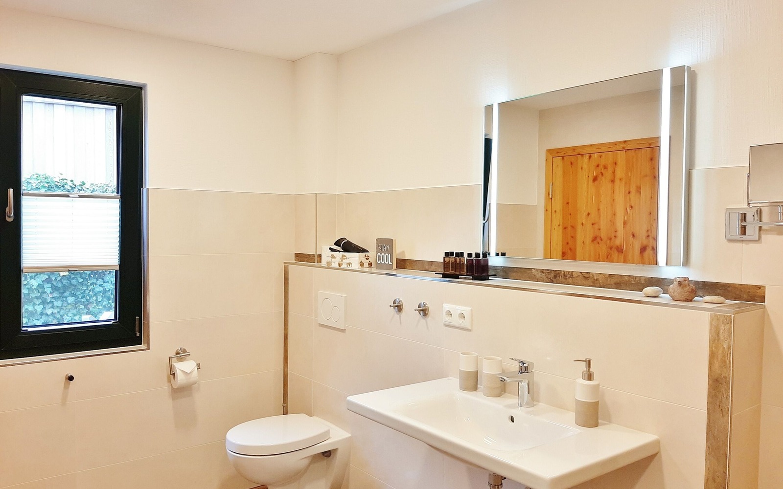 Im großen Ferienhaus (55 m²) finden bis zu 4 Personen Platz und ist im Erdgeschoss barrierefrei begehbar. Das Haus besitzt einen Wohnbereich mit integrierter Küchenzeile, einem großen modernen Badezimmer mit Dusche sowie 2 Schlafräumen im Obergeschoss. Jede Ferienwohnung verfügt über eine eigene Terrasse mit Sitzmöglichkeiten. Pkw- und Fahrradstellplätze sind für Gäste vorhanden.