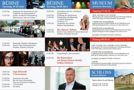 Wie immer wird es auf der Festbühne ein abwechslungsreiches Programm für Groß und Klein sowie Jung und Alt geben. Zu den geplanten Programmpunkten zählen an beiden Tagen Musik, Tanz, Basteln und weitere Aufführungen. Am Sonntag stehen zusätzlich ein Gottesdienst und der Auftritt von der "kleenen Helene" und der Kaisershow mit Steffen Heidrich – auf dem Programm. Traditionell gehören auch Stadtführungen mit der Bollmüllerin, Einblicke in das Museum "Sorbische Webstube Drebkau/Drjowk" sowie ein Handwerker- und Bauernmarkt dazu. Auch für die leibliche Versorgung ist ausreichend gesorgt.