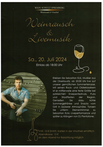 Ein Abend voller Genuss und musikalischer Highlights erwartet die Gäste in der Vinothek von Wein Schulz Spremberg. In einzigartiger Atmosphäre können Weinliebhaber und Musikfreunde einen unvergesslichen Sommerabend erleben. Für die musikalische Begleitung sorgt der talentierte Musiker Sebastian Eck aus der Oberlausitz, der mit seinen Klängen eine besondere Stimmung schafft.
