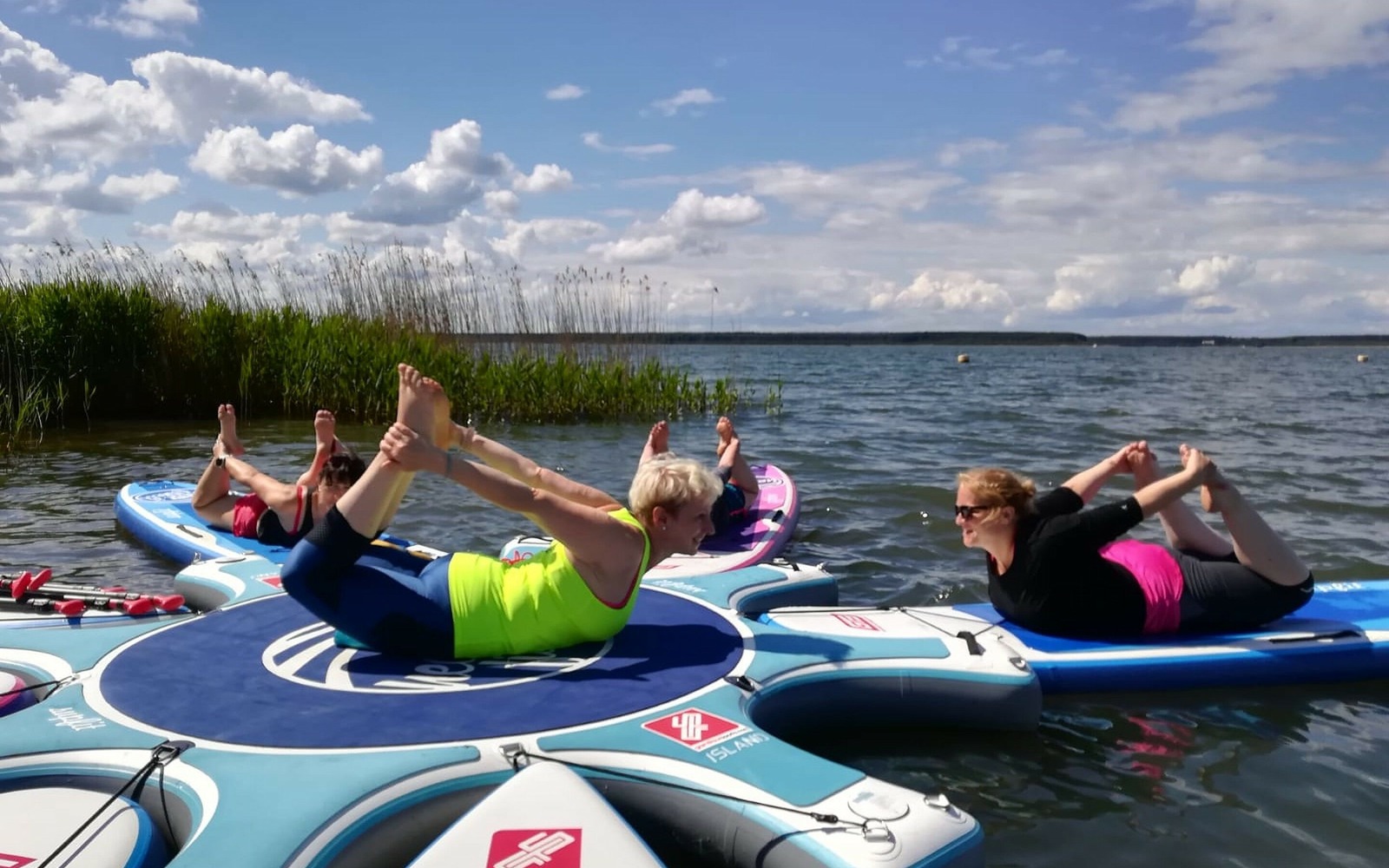 Bei SUP Yoga wird das Stand up Paddle Board als eine schwimmende „Yogamatte“ genommen. Die äußere Instabilität des Wassers unterhalb des SUP-Board stärkt automatisch die Tiefenmuskulatur und somit die innere Balance. Die jeweilige Yogaübung wirkt daher intensiver, als an Land. Bei diesem kurzweiligen Programm werden die
