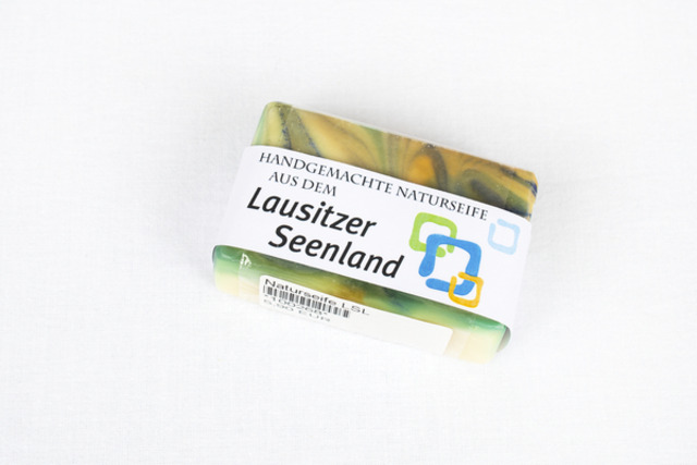 Die handgemachte Naturseife aus der Seifenmanufaktur AliSavon in Neupetershain schimmert in den Farben des Lausitzer Seenlandes und versprüht einen frischen Duft nach Lemongras. Die Seife basiert auf Pflanzenölbasis und ist handgesiedet.