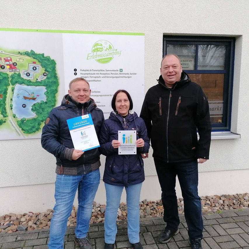 Bildunterschrift: Freuen sich über die Auszeichnung "Familienfreundlich im Lausitzer Seenland" durch den Tourismusverband Lausitzer Seenland e.V. (v.l.n.r.): Karlheinz und Silke Philipp, Betreiber des Erlebniscamping Lausitz, Marcus Heberle, stellvertretender Geschäftsführer Tourismusverband Lausitzer Seenland e.V. und Leiter Produktentwicklung Familienurlaub.