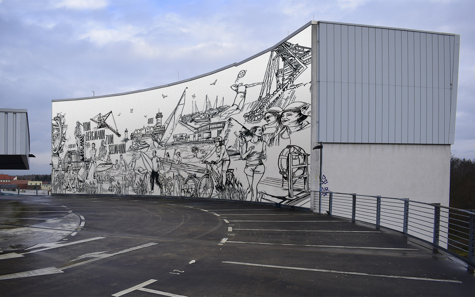 Die graue Fassade im Parkhaus am Schlossparkcenter Senftenberg soll in ein zusammenhängendes und bemaltes Gemälde getaucht werden. Im Rahmen des Förderprojektes wurde die Gestaltung aus verschiedenen Bildelementen der Kampagne ausgearbeitet. Nun soll die Fassade auf dem obersten Deck in Zusammenarbeit mit der Stadt Senftenberg, dem Theater neue Bühne und dem Kultur- und Freizeitzentrum "Pegasus" bemalt werden.
