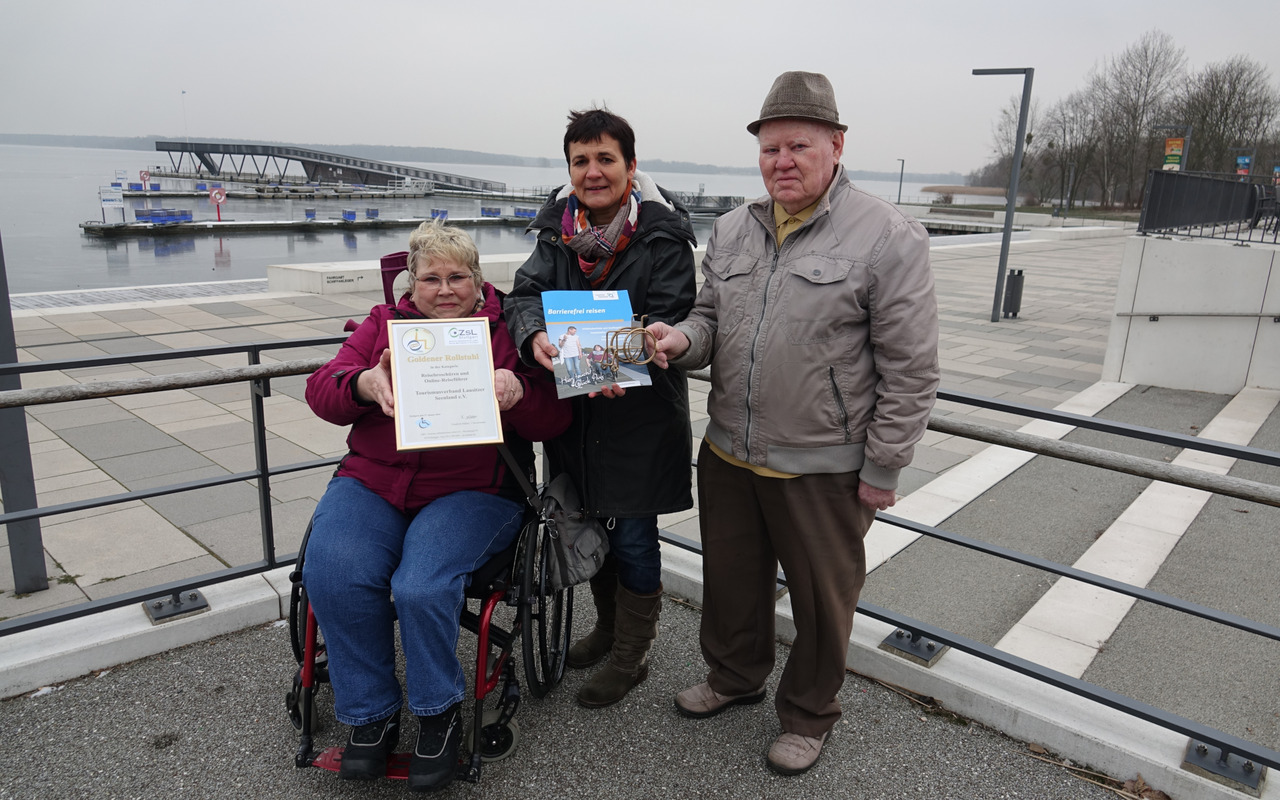 Der Tourismusverband Lausitzer Seenland e.V. freut sich mit seinen Unterstützern über die Auszeichnung: Marei Tuppatsch, Mitglied der Arbeitsgruppe Barrierefrei des Tourismusverbandes Lausitzer Seenland e.V. und Urlaubstesterin für die neue Broschüre, Kathrin Winkler, Geschäftsführerin des Tourismusverbandes Lausitzer Seenland e.V. und Manfred Müller, Vorsitzender Blinden- und Sehbehinderten Verband Brandenburg e.V. Bezirksgruppe Senftenberg mit der Urkunde und dem Goldenen Rollstuhl am barrierefreien Stadthafen Senftenberg (v.l.n.r.)