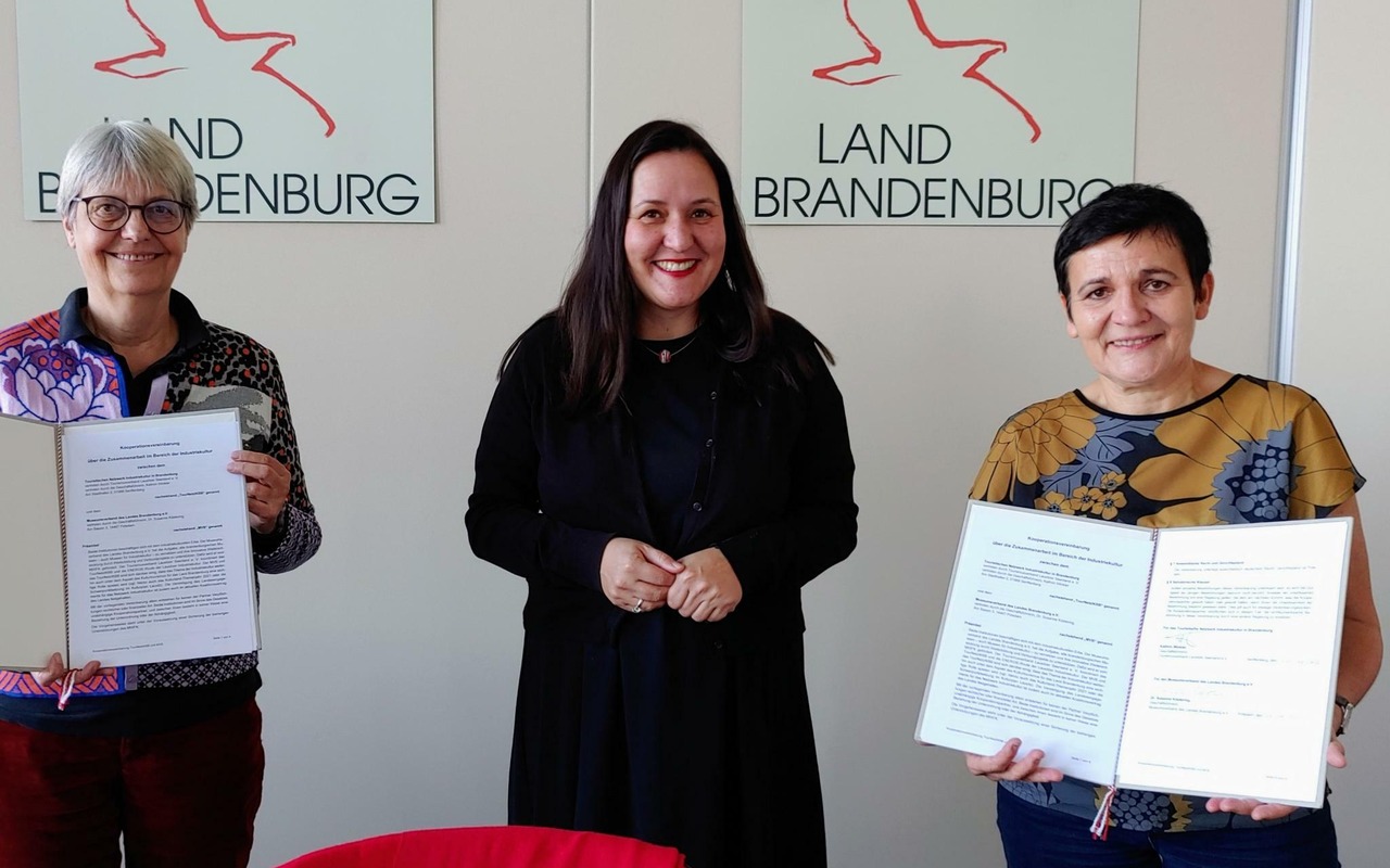 Bildunterschrift: Dr. Susanne Köstering, Geschäftsführerin des Museumsverbandes des Landes Brandenburg e.V., Brandenburgs Kulturministerin Dr. Manja Schüle und Kathrin Winkler, Geschäftsführerin des Tourismusverbandes Lausitzer Seenland e.V. und des Touristischen Netzwerks Industriekultur Brandenburg präsentierten am 20.10.2022 eine Kooperation zur Industriekultur in Potsdam (v.l.n.r.)