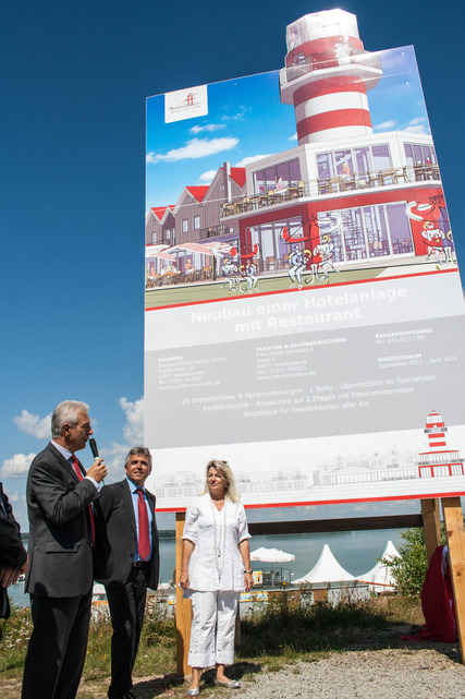 Mit der Eröffnung des Koschen-Kanals 2013 wird der sächsische Teil des Lausitzer Seenlandes an eine seit vier Jahrzehnten bestehende touristische Destination, den Senftenberger See in Brandenburg angeschlossen. Der Zweckverbandsvorsitzende, Landrat Michael Harig (CDU) sieht darin einen wichtigen Meilenstein. Dadurch erhöht sich die Attraktivität für private Investoren, deren Ideen in der Region willkommen sind. „Menschen mit Visionen, mit Mut und wirtschaftlichem Durchstehvermögen werden diese Region Schritt für Schritt entwickeln. Wir haben 23 Seen für Ihre Ideen“, sagte er. Der Vorsitzende des Zweckverbandes Lausitzer Seenland nannte ein ehrgeiziges Ziel für die touristische Vermarktung der neu entstandenen Urlaubsregion. Von derzeit 400.000 Übernachtungen jährlich wollen der länderübergreifende Tourismusverband und die kommunalen Zweckverbände in Sachsen und Brandenburg bis 2020 für ein Wachstum auf 1 Million Übernachtungen pro Jahr sorgen. Voraussetzung dafür sind Investitionen in neue Herbergsbetriebe, wie den heute erstmals öffentlich vorgestellten „LeuchtTurm“ am Geierswalder See. Unternehmerin Heike Struthoff und ihre Familie legten dafür symbolisch ihr Handtuch aus.
