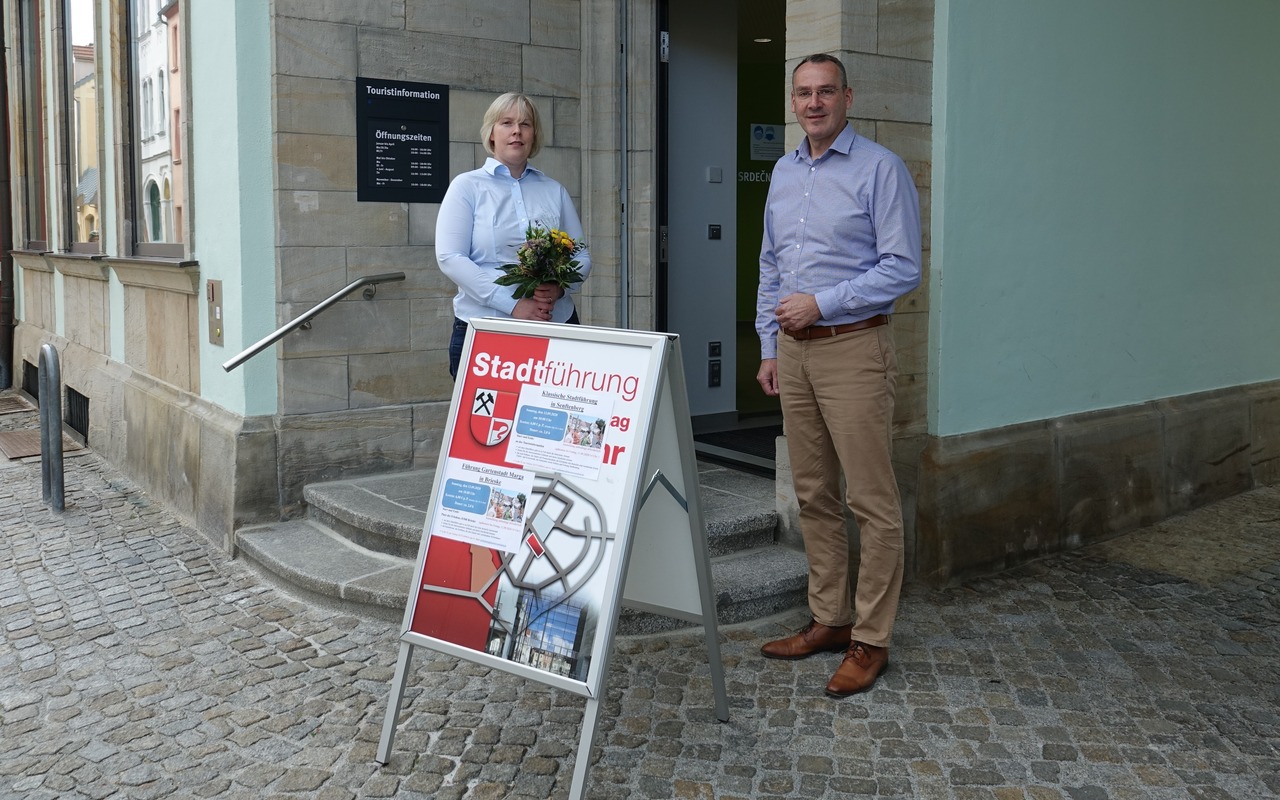 Foto Begrüßung der neuen Leiterin Dana Kersten vor der Touristinformation SenftenbergDer Senftenberger Bürgermeister Andreas Fredrich begrüßt die neue Leiterin Dana Kersten vor der Touristinformation Senftenberg (JPG; 2,46 MB)