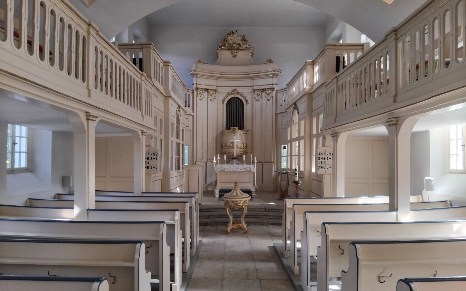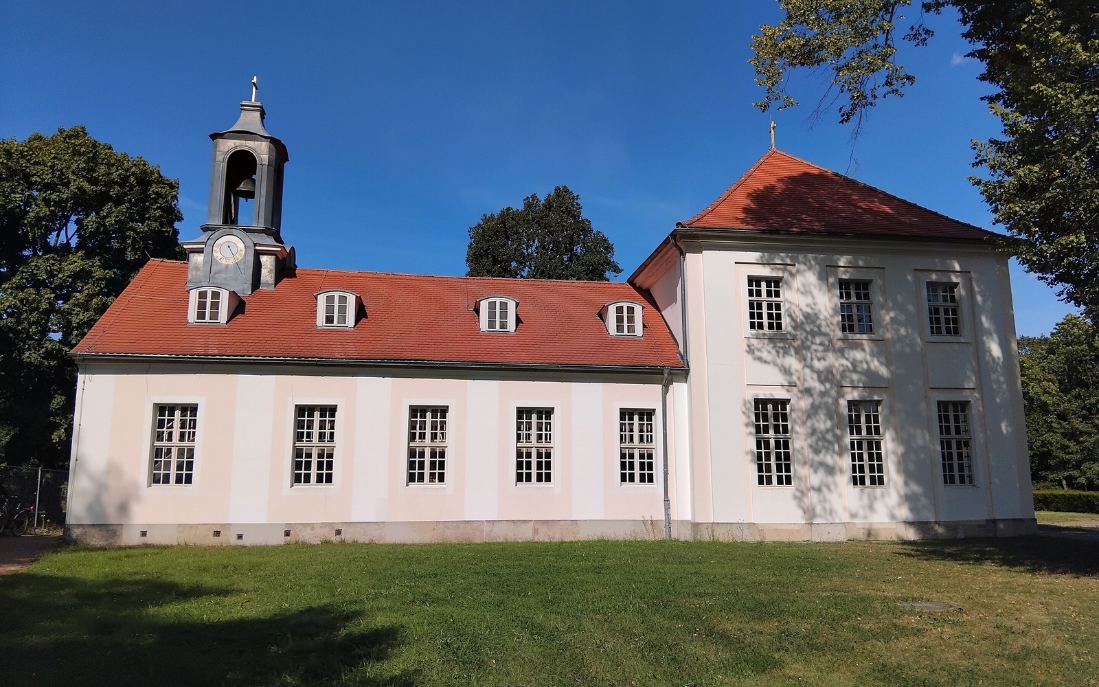 The former castle church from 1746 is also worth a visit. Instead of a bell tower, it only has a modest ridge turret, as it was adapted to the exterior of the former orangery in order to create a harmonious ensemble of buildings. The interior is in the rococo style, which is rare for churches. Concerts and other events are held in the church.