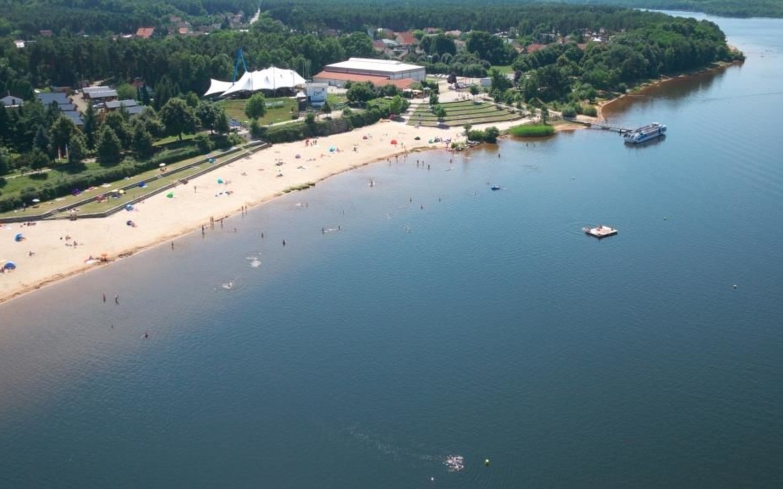 The 600-metre long bathing area in Großkoschen with its shallow sloping sandy bathing area is ideal for families with children. There is a large pay car park, a playground, various snack bars and plenty of bathroom facilities (including an accessible toilet) on site. In the high season, there is also a permanent team of lifeguards on site. There are separate naturist and non-naturist bathing areas in Großkoschen.
