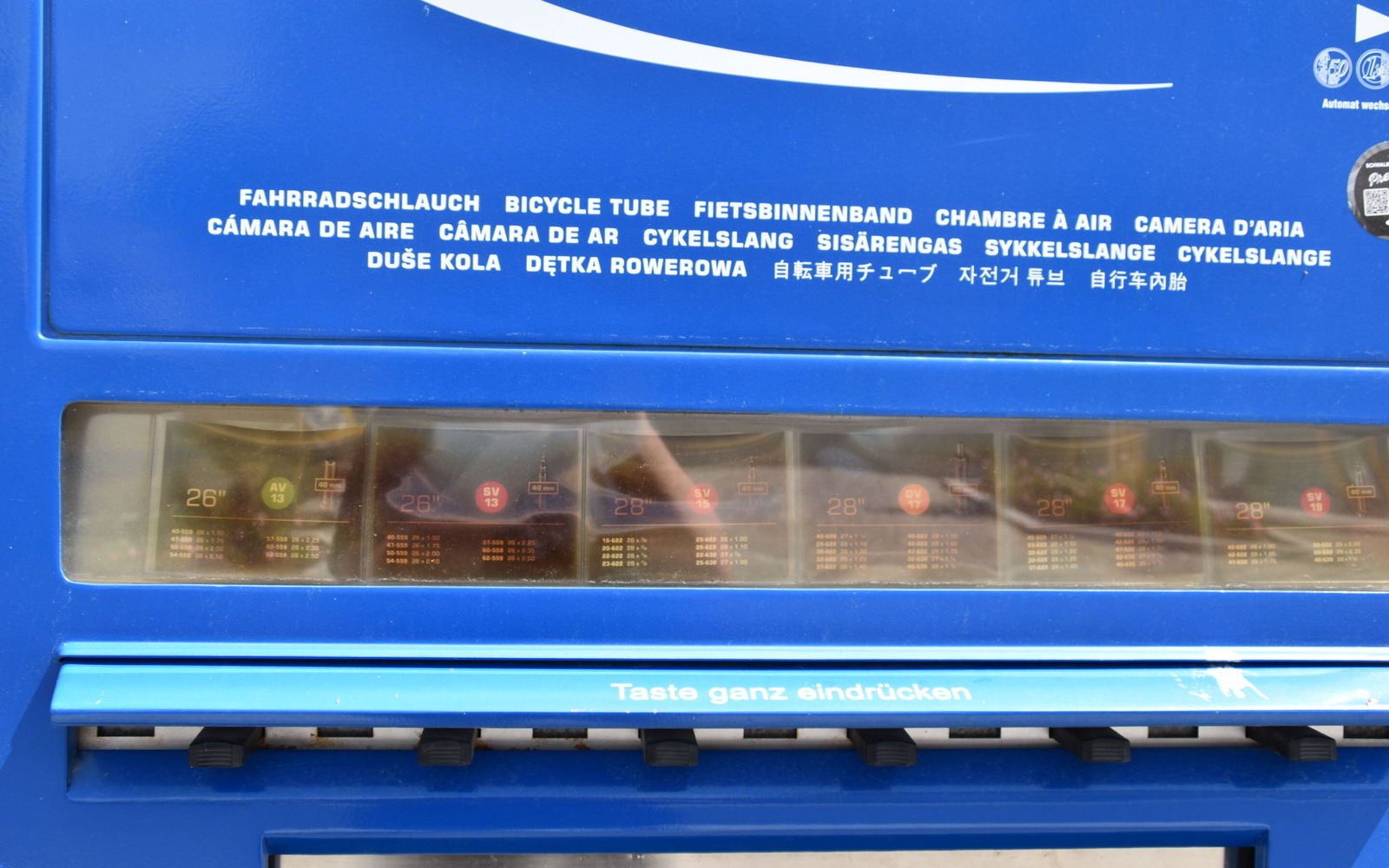 Automat na trubky je umístěn zvenčí u prodejny kol Zweirad-Center Lieske. Cyklistické duše různých velikostí jsou zde k dispozici nepřetržitě.