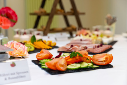 Die Gäste erwartet ein vielfältiges Frühstücksbuffet mit kalten und warmen Speisen, ergänzt durch eine Auswahl an frischem Kuchen. Filterkaffee sowie Wasser (still und sprudelnd) sind im Angebot enthalten.