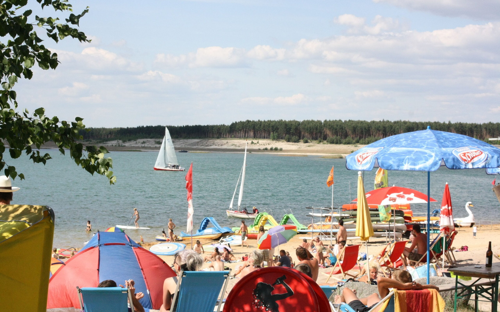 Lake Geierswalder See is located in the middle of the navigable Lusatian Lake District. A perfect day by the lake is guaranteed for all keen swimmers on Lake Geierswalder See: bathing and surfing beach, lakeside bar, various snack bars and a large chargeable parking area. There is local boat rental for pedal boats, canoes, Canadian canoes and Stand-Up-Paddling, as well as a surf and sailing school. This is also where the passenger boat stops, which operates scheduled services between Lake Geierswalder See and Lake Senftenberger See. There are camping and camper van sites in the immediate vicinity. The bathing area is guarded by German Red Cross (DRK) lifeguards during the summer months at weekends and on public holidays between 11 a.m. and 7 p.m.