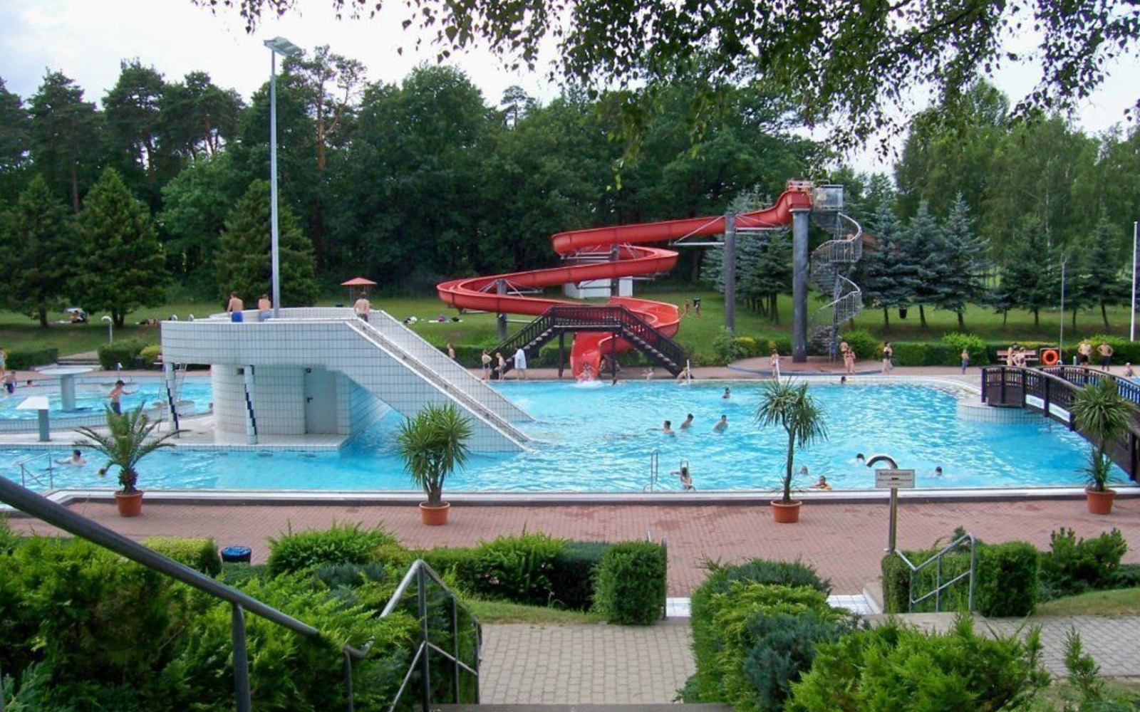 The outdoor swimming pool is idyllically situated in the forest on the edge of Spremberg. It has an adventure and swimming area and a separate area for families with small children. The adventure and swimming area has four 25-metre swimming lanes, a 72-metre long and 12-metre high slide, a current canal, water cannons, a water mushroom, a splash shower, bubble loungers and a grotto with a bubble board. The toddler area is creatively designed with a water depth of up to 60 centimetres, a gargoyle, water mushrooms and water fountains. Depending on the outside temperature, the bathing water is additionally heated with solar energy. The bathing experience is rounded off by a 30,000-square-metre lawned sunbathing area, an adventure playground, a grass and beach volleyball court and three table-tennis tables. There are also snack bars, changing rooms, social and toilet facilities and parking spaces available.