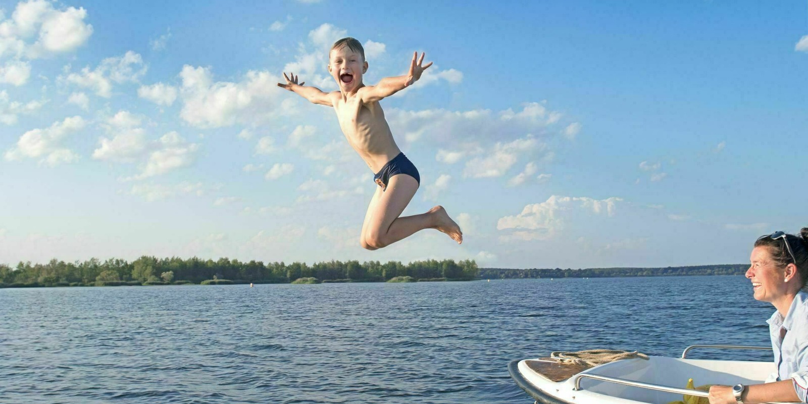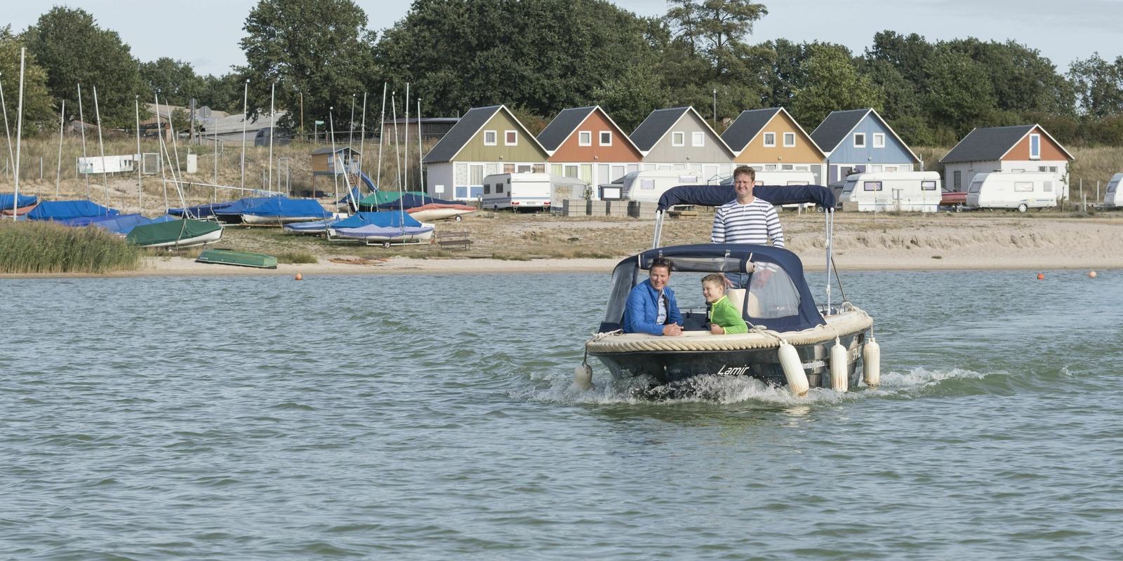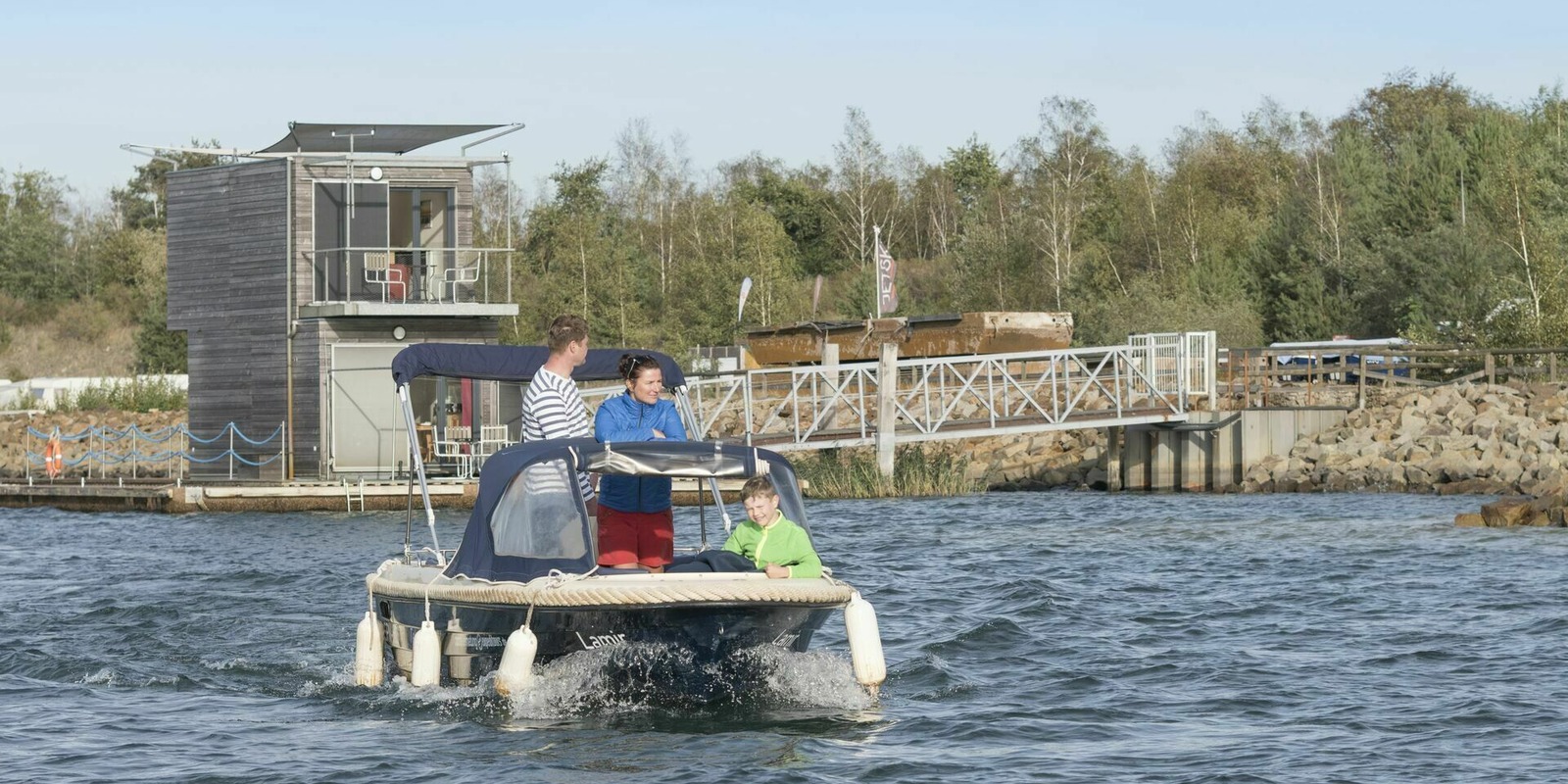 Lighthouse, water skiing, boat hire, food & drink, holiday homes and a long, sandy beach – the range of things to see, do and enjoy on and around Lake Geierswalde is best appreciated from the water. And Tom is speechless when their boat passes some floating homes. Reaching the northern end, dad slows down and turns into Barbara canal, the 1.1 kilometre long link to Lake Partwitz that opened in 2019. He carefully navigates the boat through the waterway, and the ‘Lamir’ fits comfortably under the bridge where walkers and cyclists cross the canal. Lake Partwitz stretches out in front of them. Here, on this 1,100 hectare lake, the ‘Lamir’ is allowed to go a little faster. Colourful holiday homes line the shore, and a few riders and cyclists are out on the path above the embankment. As the boat circles the long peninsula, dad takes photos of the rugged, sandy slopes, reminiscent of the coastal cliffs of the Baltic Sea. A quick detour to the Schwimmende Haus holiday home, then it’s back through Barbara canal to Lake Geierswalde. Enjoy the freedom, breathe in the fresh air and soak up the sunshine.