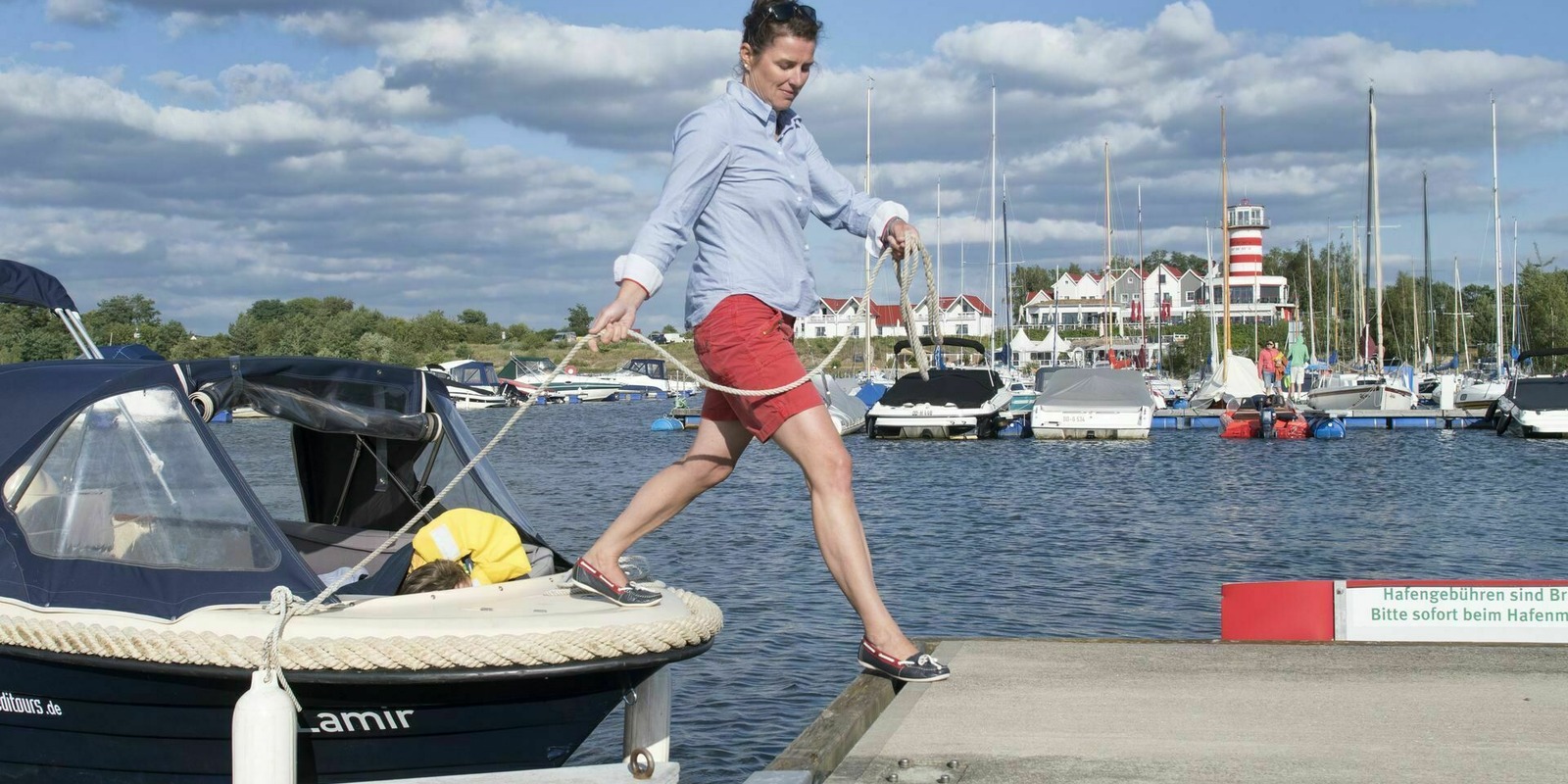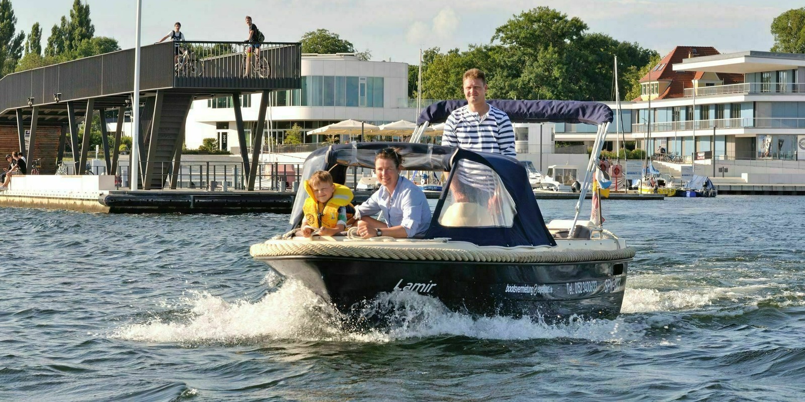 Tom faces into the wind and wipes some spray from his forehead as he keeps a keen lookout at the bow. “All clear,” the eight-year-old calls to his dad, who is at the helm. Mum quickly puts the picnic basket away and enjoys the views of the shore. The family head off in their motorboat from the Hafencamp campsite in Grosskoschen towards Senftenberg marina. Their boat, the ‘Lamir’, has a 15 hp motor which means it can be used without a licence. “It’s easy as long as you take care and use your common sense,” says Manuela Zahn, who hires out motorboats, among other things, at the Hafencamp campsite. Before starting a trip, guests are given a theoretical and practical briefing. How is the boat operated? What are the rules on the water? Which way am I going? She points to the linked lakes on a large map: starting at Lake Senftenberg, then passing though Koschen canal and on to Lake Geierswalde. The Barbara canal leads out even further to Lake Partwitz. To be on the safe side, there is a small map on board and some instructions for navigating the two canals.